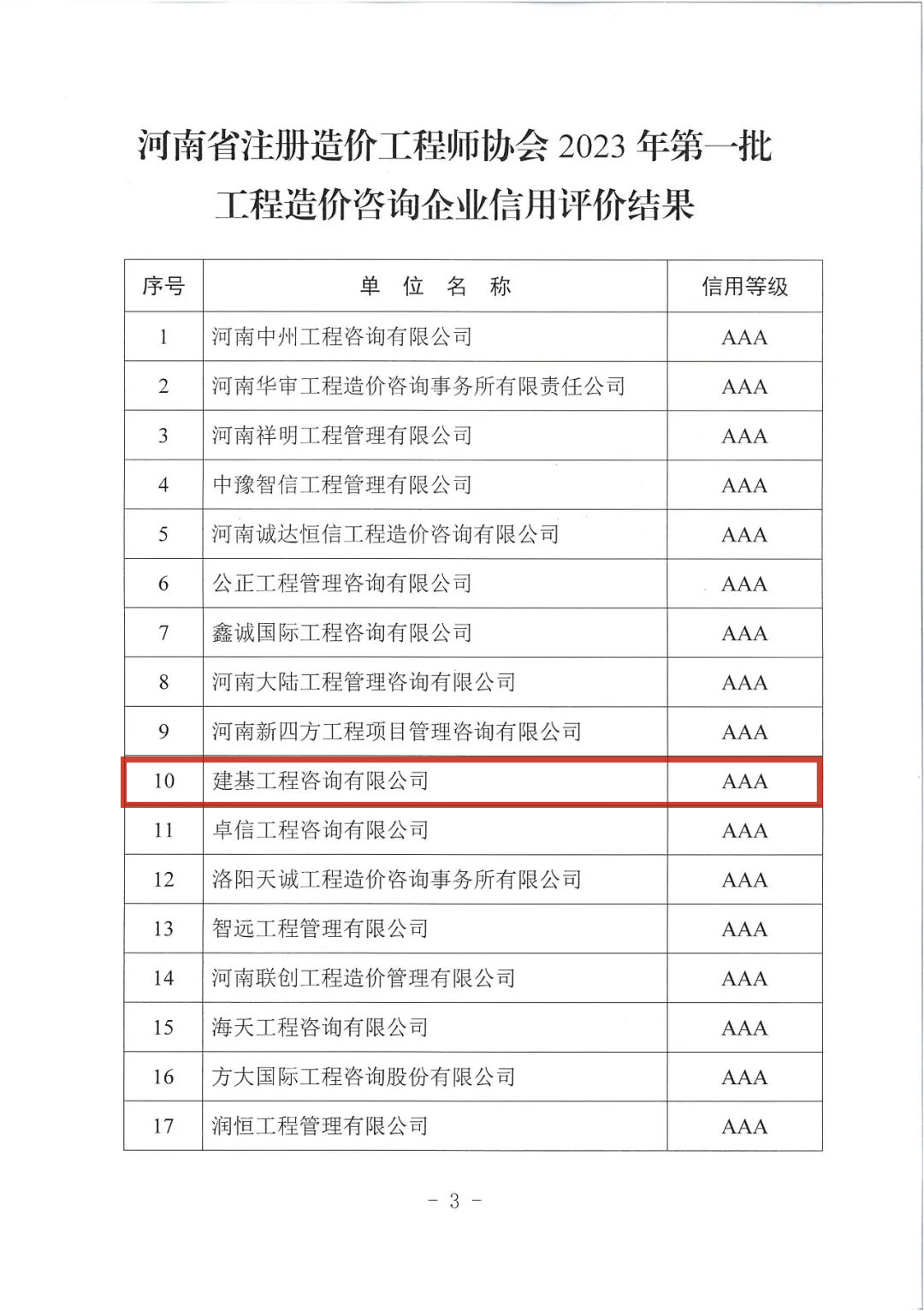 近日,河南省注冊(cè)造價(jià)工程師協(xié)會(huì)公布《關(guān)于對(duì)河南省注冊(cè)造價(jià)工程師協(xié)會(huì)2023年第一批工程造價(jià)咨詢企業(yè)信用評(píng)價(jià)結(jié)果公示的通知》,公司獲評(píng)“河南省注冊(cè)造價(jià)工程師協(xié)會(huì)2023年第一批工程造價(jià)咨詢企業(yè)信用評(píng)價(jià)AAA等級(jí)”,這一成績充分表明了公司在工程造價(jià)咨詢領(lǐng)域中的卓越實(shí)力,并進(jìn)一步樹立了企業(yè)良好的聲譽(yù)。