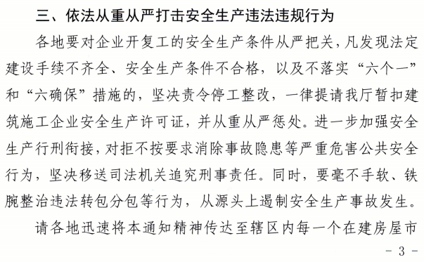 各地要對企業開復工的安全生產條件從嚴把關,凡發現法定建設手續不齊全、安全生產條件不合格,以及不落實“六個一”和“六確保”措施的,堅決責令停工整改,一律提請我廳暫扣建筑施工企業安全生產許可證,并從重從嚴懲處。