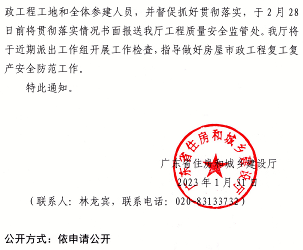 近日,廣東省住建廳發布《廣東住建廳關于做好2023年春節后房屋市政工程復工復產安全防范工作的通知》。